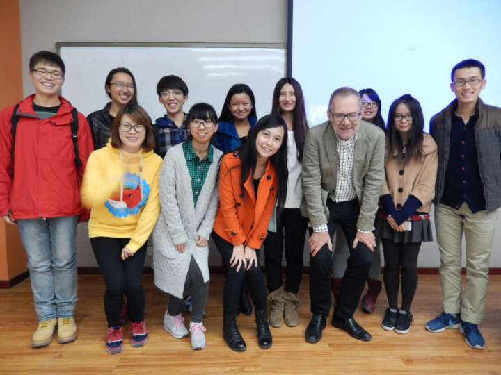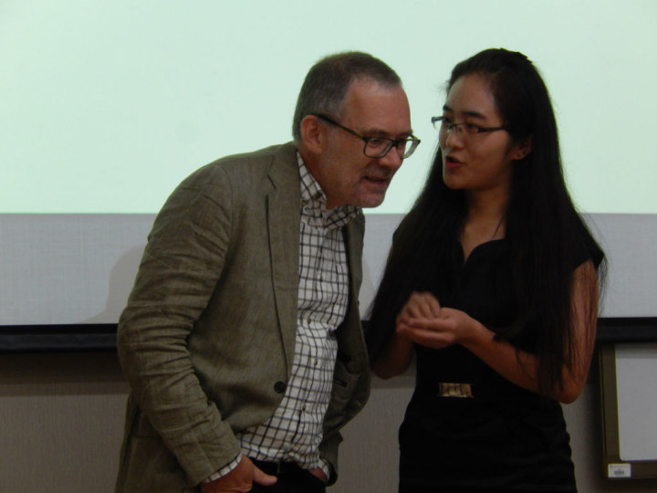到了活动的提问环节,在场同学纷纷向阿尔内教授提问。同学们提出的“如何在语言大学激发学习计算机的兴趣”、“如何看待中国IT事业的发展”、“是否将把语法框架发展到香港”等问题,阿尔内教授都逐一耐心解答,而教授的精彩演讲更是赢得现场观众的阵阵掌声。