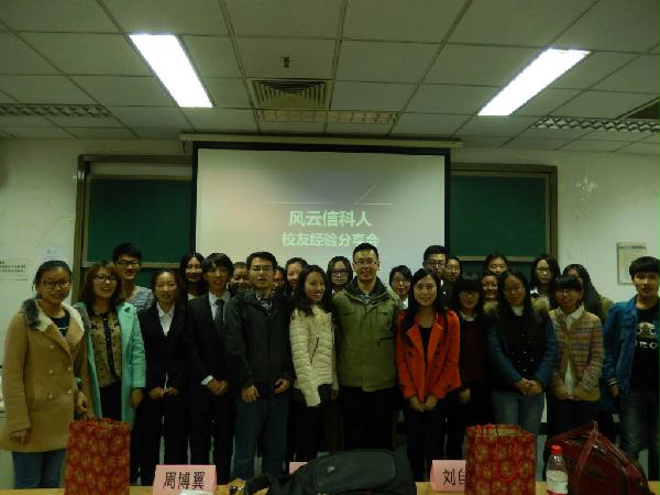 2014年11月18日晚七点,由ky开云手机版团总支学生会所主办的“风云信科人——校友经验分享会”在主楼501教室成功举办。本次活动邀请到了2006届校友周博翼、2010届校友赵帅、2012届校友刘自慧为在校的信科学子分享了他们从进入大学到毕业一路走来的宝贵经验。