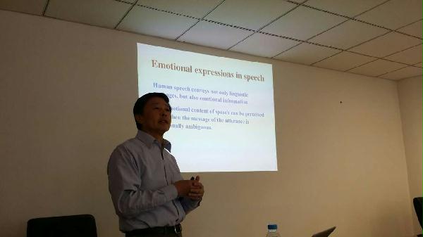 应张劲松教授邀请,2015年04月03号,伦敦大学学院(University College Lundon)许毅教授(Dr./Prof. Yi Xu)来我校访问。许教授的研究兴趣包括语音产生、语音知觉、韵律建模、二语习得、情感语音等领域,在国际一线期刊和会议上已发表了数百篇学术论文,是国际语音领域的知名学者。当日下午, 在综合楼1125室,许教授给来自校内外近百名师生作了题为:Cracking the emotion code in human speech (解析语言中的情感密码)的学术报告。在报告中,许教授从达尔文生物学进化论的角度出发,介绍了情感表达对于动物生存和进化的意义,进而探讨了这一功能在人类进化中的重要作用,最后引申到人类语言中情感密码的奥妙。报告激发了大家探索情感语音奥秘的兴趣,引起了热烈的讨论。除了情感语音问题,部分师生还就汉语语音与语调内容请教了许教授。