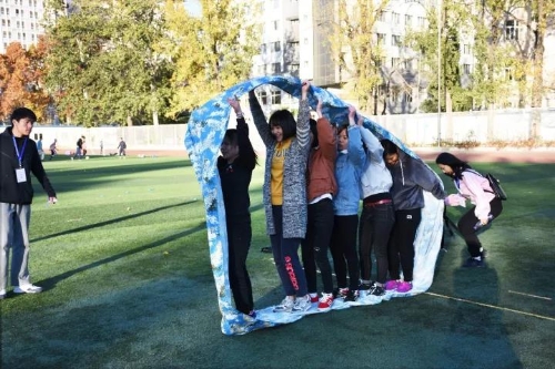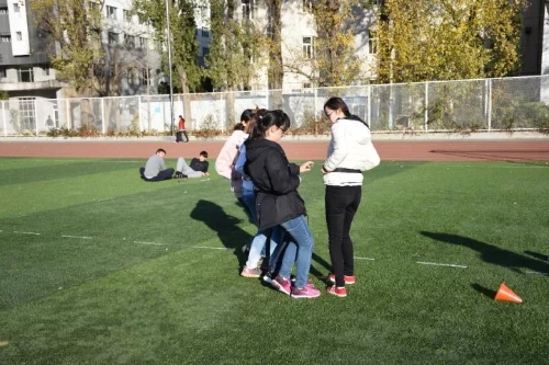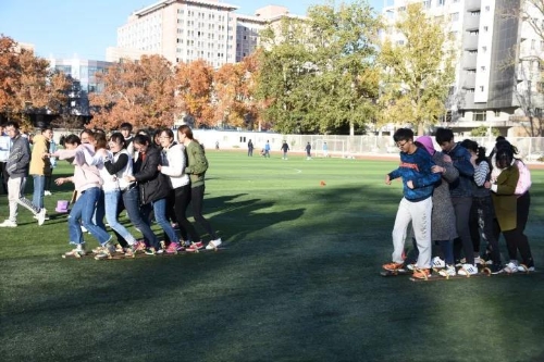 随后,是集体项目的时间。大家等距站好,采用腰带式相连的双人跑步,齐心协力成为顺利通关的不二法则。而后“风火轮”与“大拖鞋”上的集体行走,并肩作战,给同学留下了难忘的印象,建立起深厚的友谊,更诠释了“众人拾柴火焰高”的集体精神。同学们的欢声笑语此起彼伏,呐喊助威声不绝于耳,如深秋中的暖阳般温暖心扉。