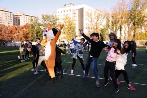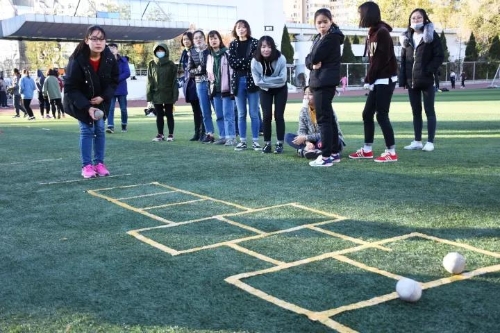 第一环节参赛的同学一边摇呼啦圈,一边吹气球,实在是是体力与巧劲的双重考验。第二环节的同学两两一组,将气球夹于身后,小心前行,默契度成为此环节的通关必备。“跳房子”仿佛将大家带回那个纯真美好的童年时代,“摸石头过河”又将模式切换回“好事多磨”的成年岁月。新奇多样的项目设置与同学们的阵阵欢笑,成为操场上一道亮丽的风景线。