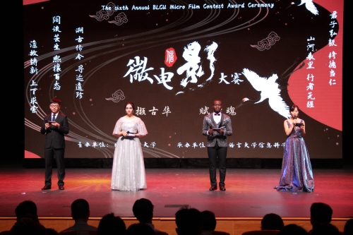 5月7日19:00,“撷古华 赋新魂”北京语言大学第六届微电影大赛颁奖典礼暨首映式在梧桐会堂顺利举行。受邀出席本次活动的领导和嘉宾有北京电影学院副教授、硕士生导师、动画学院动画系主任张丽老师,北京语言大学黄益方副校长,党委宣传部常务副部长、教师工作部部长展明峰老师,学生处副处长张洋老师,教务处副处长陈亮老师,商学院副书记张坤老师,信息科学学院副书记李吉梅老师,各学部、院的辅导员老师及校内各职能部门的嘉宾们。颁奖典礼由汉语学院林真心同学、人文社会科学学部莱昂同学、语言康复学院黄琪琪同学以及信息科学学院尹胥同学共同主持。