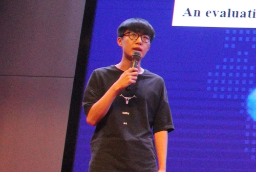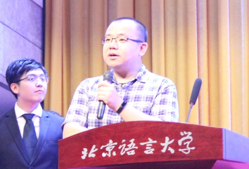 随后典礼拉开序幕,首先是人工智能类参赛成果展示及颁奖。获得中国大学生计算机设计大赛国家级一等奖的王静懿、刘冬滢展示了“基于神经网络辅助对外汉语声调教学研究”项目的完成过程。从数据准备到方案设计与接口制作,她们踏踏实实地走好每一步,展示了信科学子的风采。指导老师解焱陆表明,作品的优点是突出了北语特色的对外汉语教学,并与人工智能结合,具有创新性和实用性。同时,老师对15-18年中国大学生计算机设计大赛获奖数据进行了统计,对大家在这个赛事上的成绩做出了肯定。紧接着,黄益方副校长为人工智能类作品颁奖。