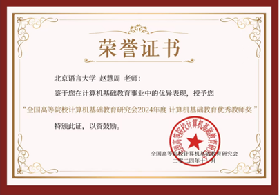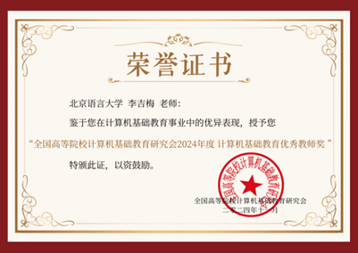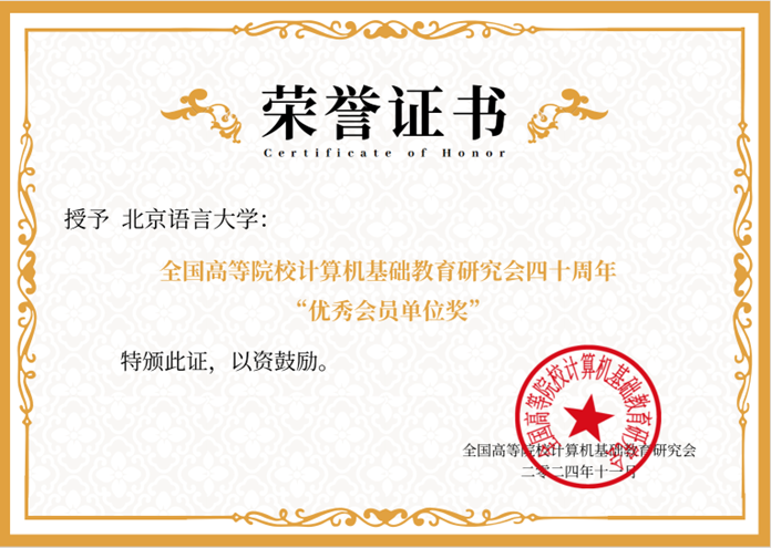 为表彰我校在研究会发展过程中的突出贡献,在研究会四十周年庆典大会上,我校荣获“优秀会员单位奖”,信息科学学院的李吉梅教授、赵慧周副教授同时获得“计算机基础教育优秀教师奖”。我校黄月副教授,也曾于2021年荣获研究会的 “计算机基础教育新星教师奖”
