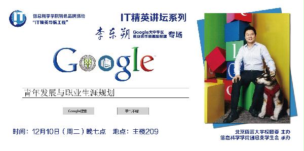 还在思考如何才能走上成功的发展之路吗?还在迷茫于怎样规划日后的职业生涯吗?不用再去谷歌搜索答案了!谷歌商业合作部高级经理李东朔亲临北语,为你答疑解惑!明晚7点主楼209报告厅,IT精英系列讲坛李东朔专场,敬请关注!