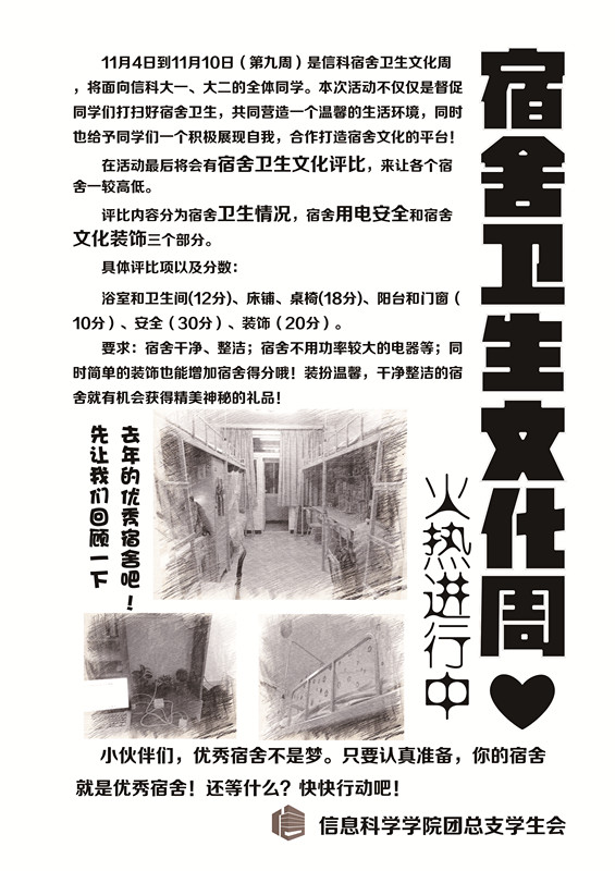 为此,我们将在3月16日晚展开信息科学学院宿舍卫生文化检查与评比活动。以下是我们的评分细则: