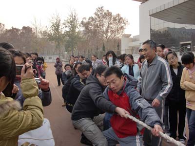 为确保安全竞技,全体师生在体育部部长吴丞司的带领下做了赛前准备活动。热身后进行运动会的第一个项目----师生拔河比赛,由教师与学生分别组队,采取三局两胜制。比赛双方实力相当,在两局结果1:1的情况下,伴随着“我想要飞的更高”等充满激情的音乐,震天的加油呐喊声将赛式推向白炽化,最终由学生队获得胜利。 运动会的第二个项目是团队障碍赛,由“五人六足”、“暗度陈仓”、“真情解救”、“障碍传水”四个环节组成。参赛者以小组为单位,每组六名队员,通过所有比赛环节用时最少的小组获胜。各组队员积极配合,同心协力,在各个环节都表现出色。运动会的第三个项目是团队跳大绳。六名队员为一个团队,队员排队循环跳,一分钟跳过的人数最多的组为获胜组。同学们活跃的身影穿梭在高高扬起的大绳间,彰显出四射的活力。
