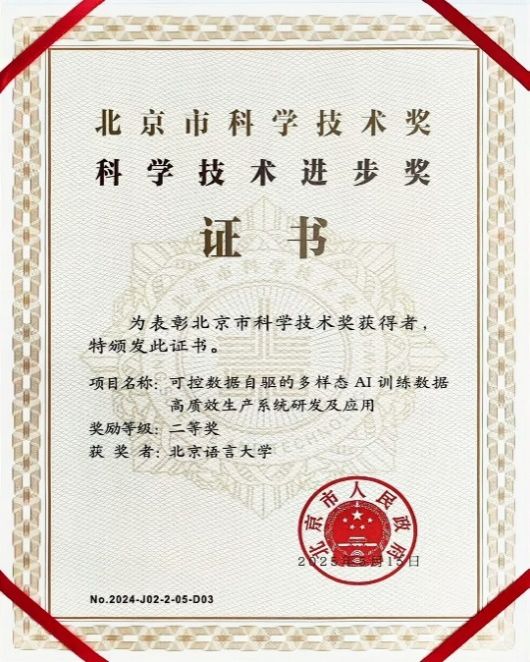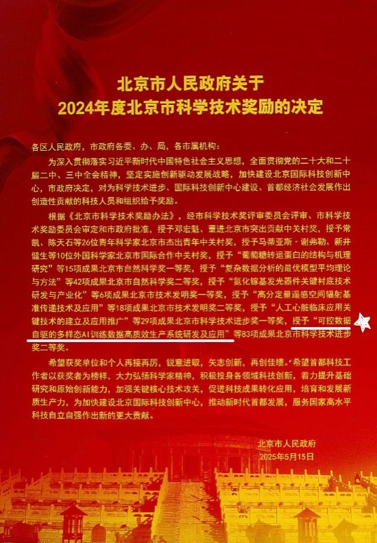 2025年11月7日,2024年度北京市科学技术奖励大会在北京隆重召开。北京市人民政府对一批在科技创新领域作出突出贡献的个人和项目进行表彰。ky开云手机版联合海天瑞声、清华大学、中国信息通信研究院共同申报的“可控数据自驱的多样态AI训练数据高质效生产系统研发及应用”项目,荣获北京市科学技术进步奖二等奖。