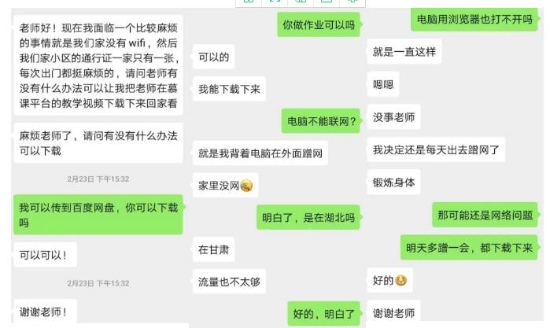 还有一位西北的同学家里没有WiFi,请求老师把慕课平台的视频下载下来回家看,老师同意后,于是背着电脑在外面蹭网,好在再蹭一次就够了。这位同学就是新时代的凿壁偷光。只要拥有一颗想学习的心,办法总是有的。不过非常时期,还是提醒同学们一定要注意安全,保障身体健康最重要。