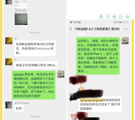 对于线上课程中会出现的问题,信科院的老师们已在开课前做好充分准备,每门课程不仅有PlanA,还有PlanB、PlanC。例如计算机公共教研室从接到新学期采用线上授课方式后,即发动讲授本学期《信息管理》课的几位老师,群策群力,开发MOOC授课资源,截止目前,已制作完成截止到3月底的线上授课微视频50个(合计约300分钟)、按次授课的知识点提纲、电子教案、作业、测验等资源,并于2月19日完成所有资源的上传转码工作。课程采用“北语慕课网站+学习通APP”同步发放教学资源和微信群答疑方式进行。在上课前一周均和学生建立了微信群,发放调查问卷统计学生电脑和软件环境配备情况,并根据学生反馈提供了对应的解决方案、联合学校网络中心成立了专门的安装问题解决小组。对于老师们的充分准备,学生反馈“太周全了,想不学是挺难的”。