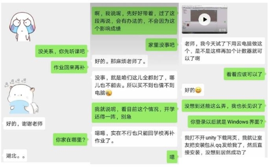 在数媒教研室刘颖滨老师的《游戏软件设计与开发》课堂上,有位在湖北的学生放假前想着早点回校实习,就没带电脑,结果因为没有电脑没办法做作业。又因为封城,同学买不到也借不到电脑。但同学并没有放弃,而是自己想办法租了云电脑,然后又求助室友发了安装包,顺利解决了电脑问题。信科同学解决问题的能力确实让人佩服。非常时期,激发的潜能也是平时累积的结果。这种解决方案老师也没有想到,这可谓是教学相长。